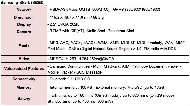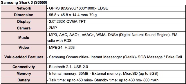 • Seoul, Korea, January 14th, 2010 – Samsung Electronics, one of the world's foremost makers of mobile phones, today announced a sleek, tactile new mobile phone, the powerful Samsung Shark range. The first devices in the range, the candy bar Shark (S5350) and slider phones, devices Shark 2 (S5550) and Shark 3 (S3550), will be available from January.