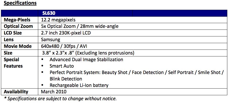 The preview screen is a 2.7-inch LCD with 230k pixels. No word on pricing from Samsung, but the SL630 is set to arrive in March 2010.