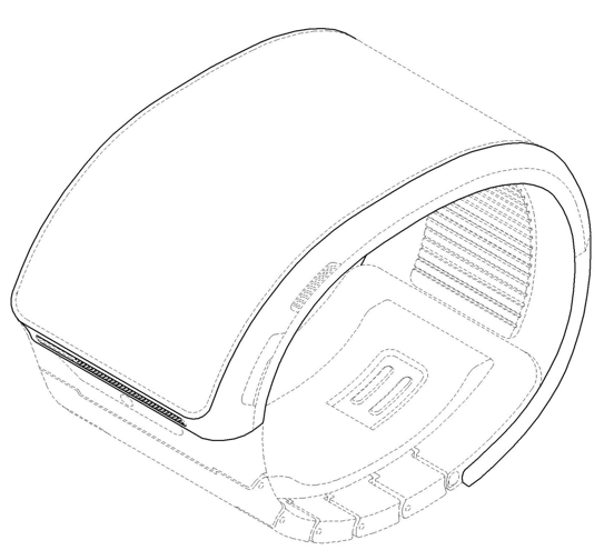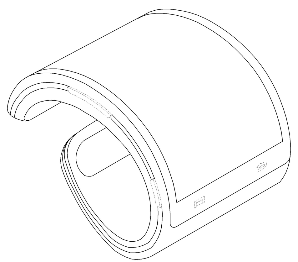 As for the designs themselves, there are three different filings, each with slightly different riffs on a similar aesthetic. The most interesting is the version which uses what appears to be a bending display, stretching out flat in one iteration but then wrapping around the wrist for general wear.