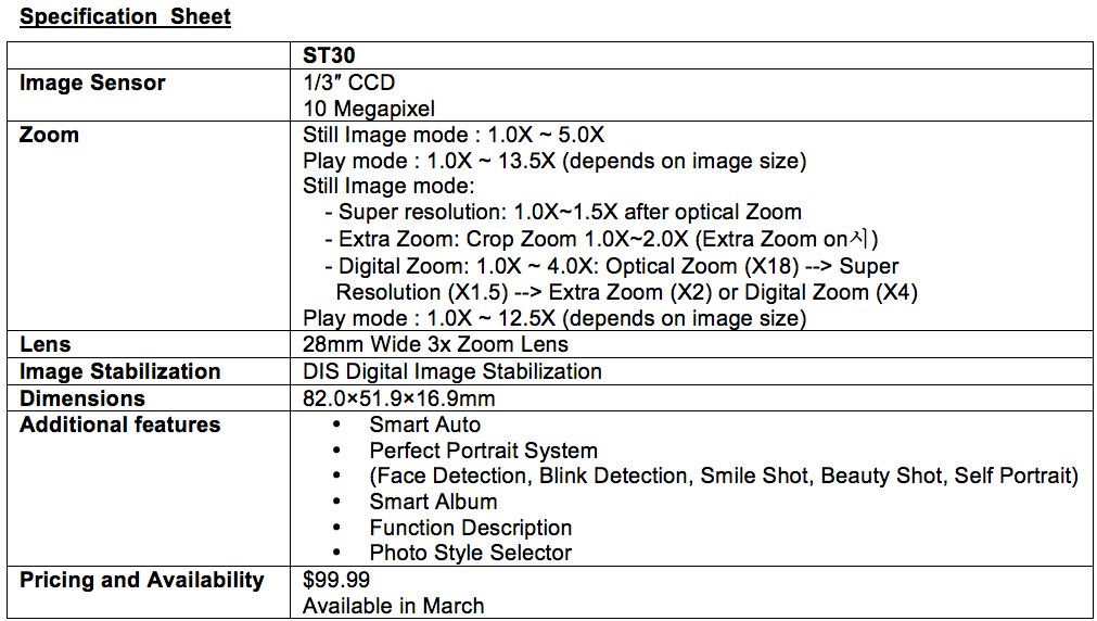 The Samsung ST30 measures a mere 82.0 x 51.9 x 16.9 and has a 3x optical zoom; it also gets Perfect Portrait mode for brushing out any blemishes and making sure the frame is only snapped when the subject's eyes are open. It's expected to be priced at $99.99.