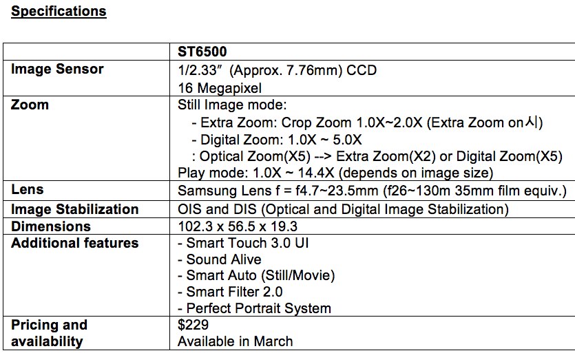 SEOUL, Korea – January 19, 2011 – Samsung Electronics Co., Ltd, a global leader in digital media and digital convergence technologies, announced the latest addition to its design-led camera portfolio, the ST6500, reinforcing the company's position as a global leader in digital imaging innovation and a pioneer of stylish design and ergonomic usability. The launch follows the success of Samsung's recent cameras such as the ST5000 which showcased a fluid and sleek design approach.