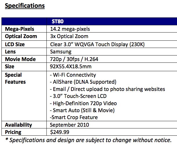 Ridgefield Park, NJ (July 28, 2010) – Samsung Electronics Co., Ltd., a global leader in digital media and digital convergence technologies, today unveiled the ST80, a 14.2 mega-pixel point and-shoot camera that joins Samsung's growing line of Wi-Fi enabled digital cameras. With wireless technologies such as Wi-Fi and Samsung's AllShare™ (DNLA) connectivity, the ST80 makes it easy to share images on the move and keep friends and family updated from anywhere at any time.