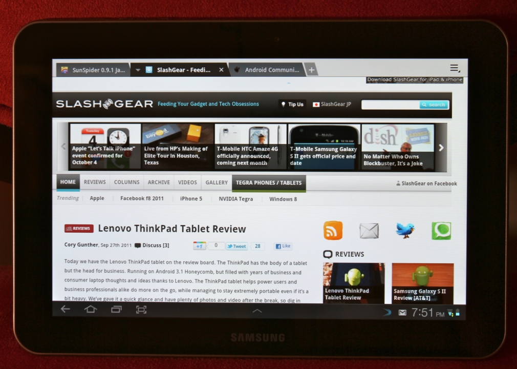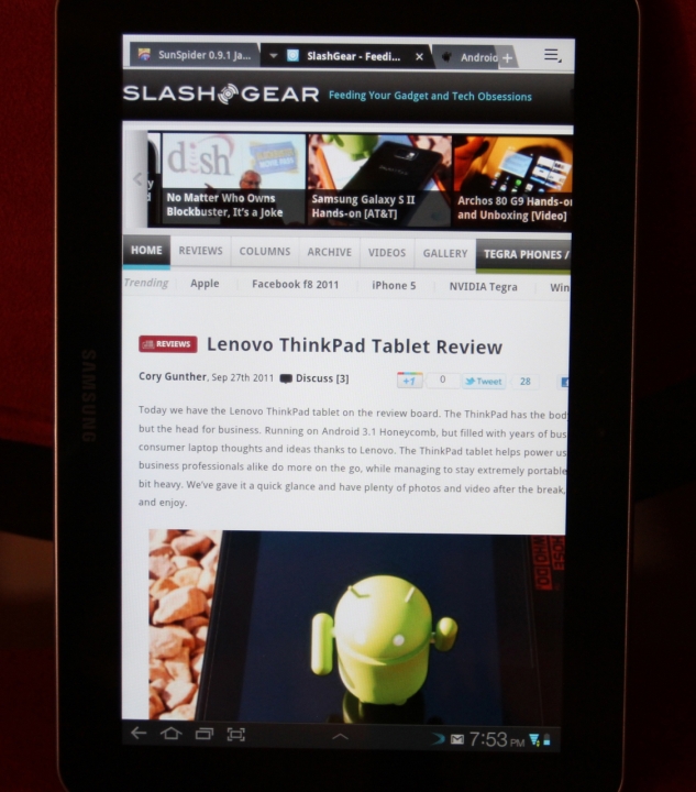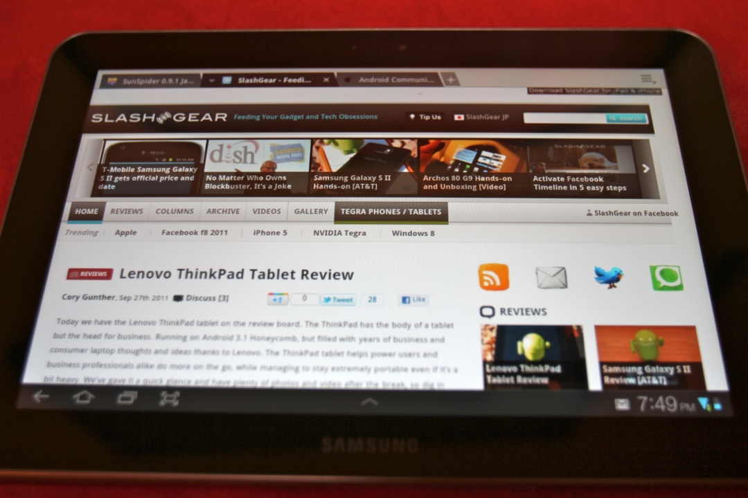 Performance from the 1GHz dual-core Tegra 2 processor isn't anything we haven't seen before, but Android 3.1 runs along at a brisk pace just as you'd hope. We'll be benchmarking and doing battery testing in time for the full SlashGear review. Samsung has been going for "bigger is better" in its smartphones, screen sizes gradually increasing with each generation; could the reverse be true for its tablet line-up?
