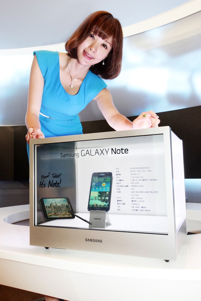That opens up the possibility for interactive display cases, such as the demo model Samsung knocked up for the Galaxy Note above, where details about the device being shown off can be overlaid onto the glass. The screen itself relies on the same transparent tech Samsung demonstrated back at CES, with "industry-leading" light transmittance.