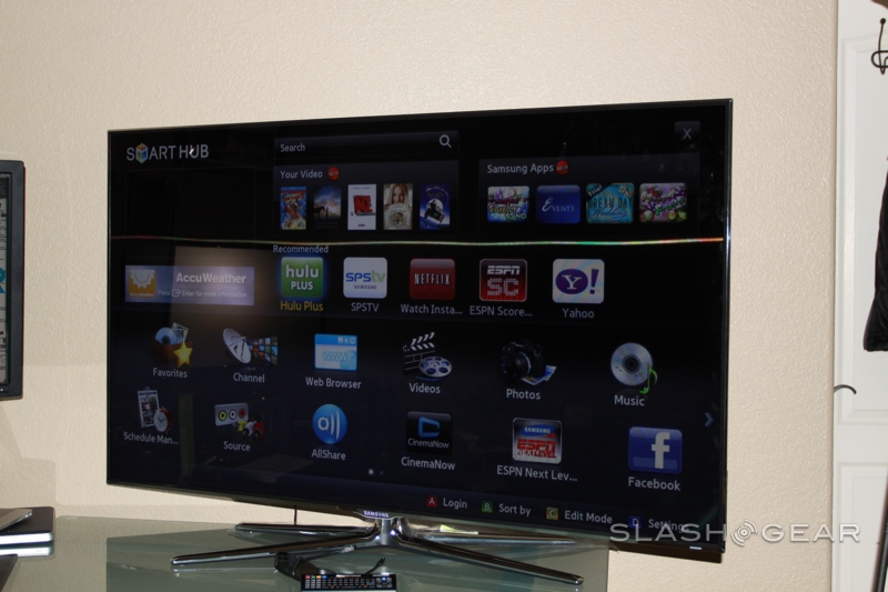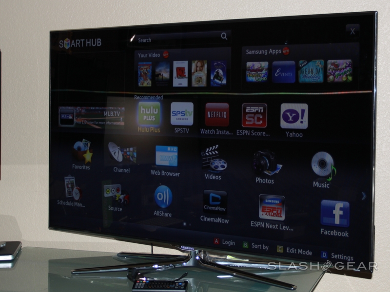 Samsung Smart Hub can be pretty confusing at first glance, with a screen full of icons. Up top is the search bar along with Samsung Apps and recommended titles, while underneath is a side-scrolling menu of links to Favorites, channels, the program guide, videos/photos/music, AllShare, the browser, Twitter and more. It's reasonably intuitive to control, though it would've been useful to have a motion-sensing remote like some LG TVs offer.