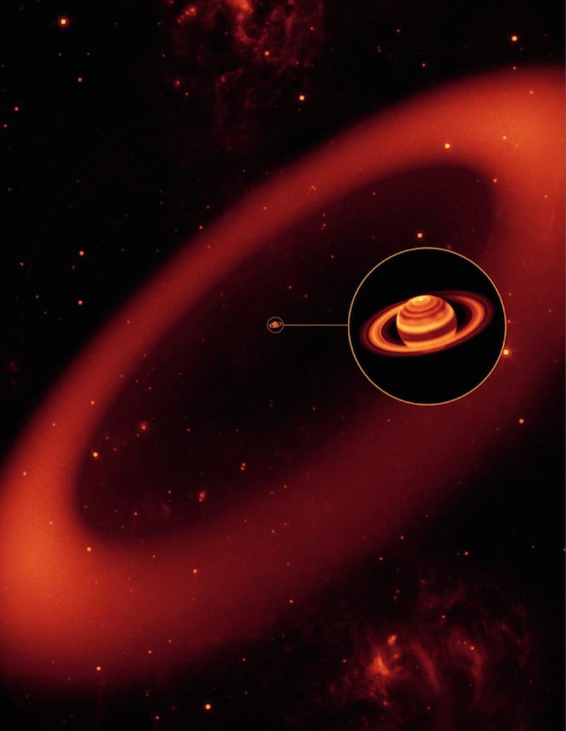 The image came from the NASA WISE spacecraft and the team has determined that the Phoebe ring is made predominantly of small dust particles about 10 microns in size. The orbit of this ring is tilted 27-degrees from the main ring plane with the bulk of the material starting at about 3.7 million miles from the planet.