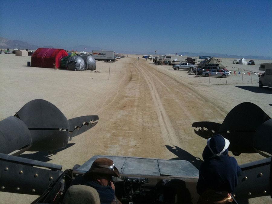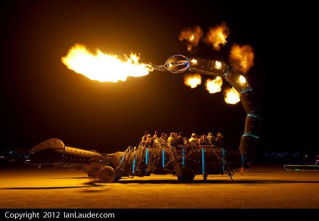 Another hydraulic system makes the entire vehicle lift off the ground. The entire works is covered in sculpted metal sheathing and steam punk style rivets. A multicolor light show makes key points on the vehicle glow for cool effect at night. The designer and builder of the vehicle is Kirk Jellum, and aerospace engineer that worked on the James Webb Space telescope.