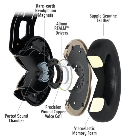 The over-ear model features 40mm drivers with precision-wound copper voice coils and rare-earth neodymium magnets. The ear pads are made from memory foam that conforms to each user's ears when warmed. The headphone can also fold to fit into a travel pouch and they come with two gold-plated audio cables, a case, a gold-plated 3.5mm quarter-inch adapter, a computer adapter, and a clothing clip.