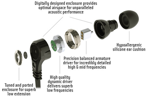 The earbud model features a bi-hybrid motor structure with a 10.7mm dynamic driver for low frequency reproduction and 6.3mm balanced armature drivers for mid and high frequencies. The soft ear cushions are made with hypoallergenic silicone.