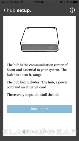 Setting up Scout is a more rigorous process than others like it. Each sensor is set up one-by-one, and Scout likes to make sure everything is in working order before you move on. It's fine, just a little fussy. The screenshots below are just the set-up process for the hub — tedious, but great for the novice, which I can really support.