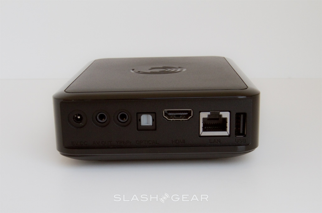 Outwardly it's not exactly the most eye-catching of devices, a gloss-finish black plastic box roughly the size of a book. Up front is a hinged door hiding the GoFlex drive bay, on the side a single USB 2.0 port, and along the back are power, component and composite outputs (both requiring the included adapter cables), digital S/PDIF, an HDMI 1.3 port, a 10/100 ethernet port and another USB 2.0 port. Seagate also bundle an infrared remote control and an ethernet cable, though there's no integrated storage.