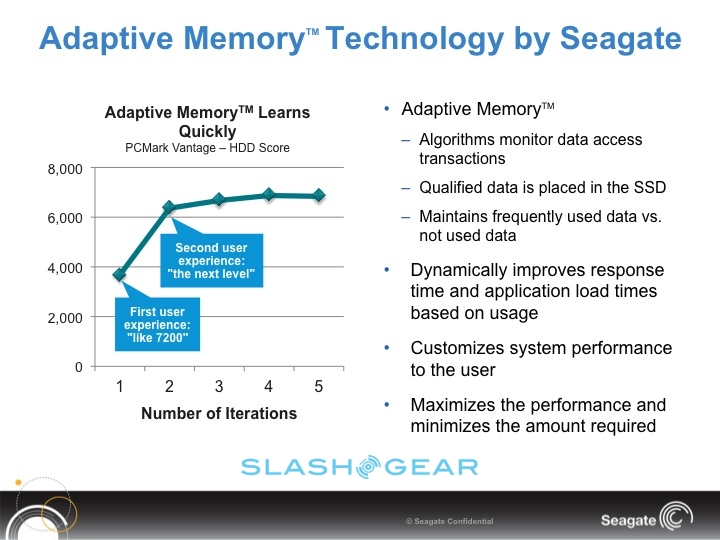 Adaptive Memory basically monitors which files are opened frequently and which data is regularly accessed, and intelligently shifts those into the faster, solid-state memory. The first time you open a file, Seagate say, the Momentus XT is on a par with a regular 7,200rpm HDD; the second time, it's more like an SSD. Over time, the hybrid drive creates a custom partition in the SSD memory suited to how the individual uses their machine.