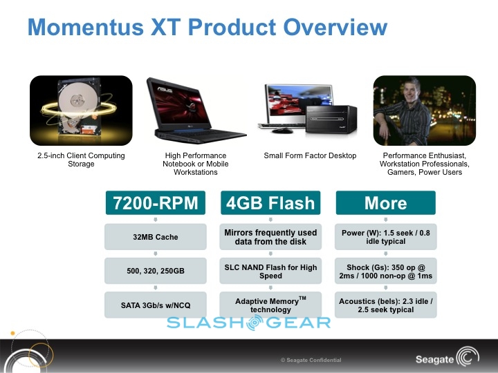 Best of all, though, is the price. The 250GB Seagate Momentus XT is priced at $113, the 320GB Momentus XT is $122 and the 500GB Momentus XT is $156, all considerably cheaper than you'd pay for a comparably sized true SSD. ASUS have already announced they'll be offering the Momentus XT as an option in their Republic of Gamers (ROG) G73Jh notebook.
