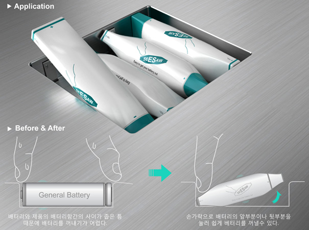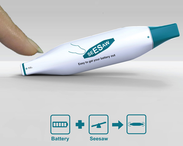 From designer Young Suk Kim, this battery that would make the frustrating task of getting those darn batteries out the compartment a lot easier. And there's no need to break a fingernail in the process. It's called the Seesaw, and the ends of the battery are tapered, so that you can push down on one end and the other end pops up!