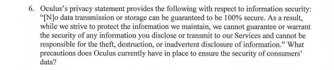 This is perhaps my favorite question outlined by the Senator. Because of the wording in the Terms and Conditions, they're basically saying that they can't be held responsible for anything that happens to all of this data that they're collecting. After all of that legalese about collecting your information, now they're saying "but if something happens and your private information is exposed, you agree that we are not responsible for it." And if you want to use that device that you just shelled out $600 for, you have to go ahead and agree, without knowing anything about the security measures that they have in place to protect your data.