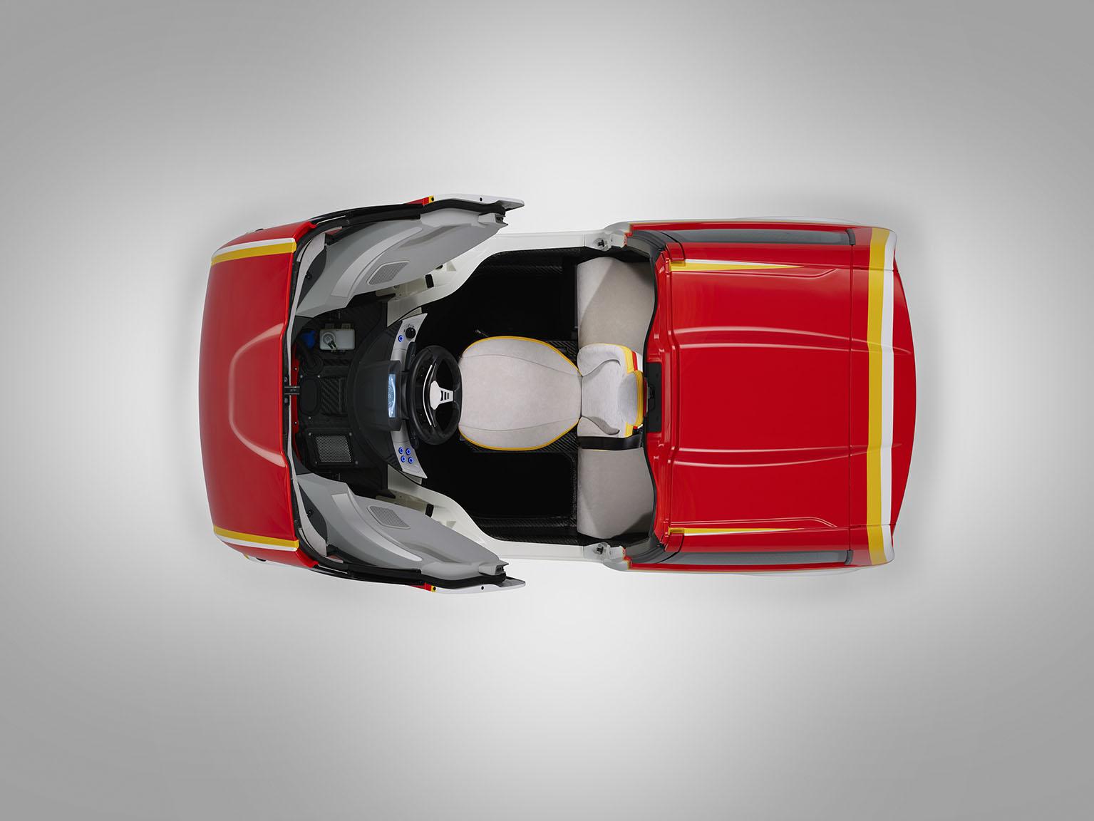 The car doesn't have any individual doors, but rather the top, sides, and windshield are a single piece that opens towards the front, as seen in the images here. Contributing to the light weight is a body that mostly made from recycled carbon fiber. The two passengers are seated on each side and slightly behind the driver.