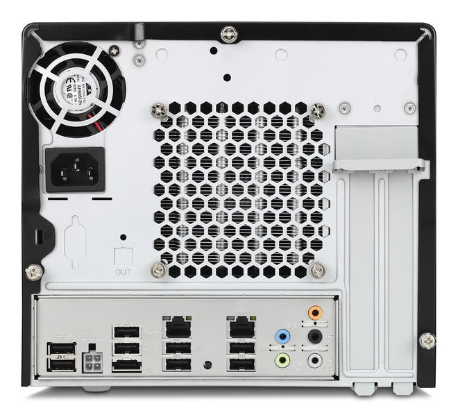 There are also two PCI-E-x16 slots – for either a single dual-slot card, or two single-slot cards in CrossFireX or SLI configuration – together with two gigabit ethernet ports with switchable failsafe or load-balancing. Meanwhile there are two internal SATA bays – complete with RAID support – and a total of four SATA interfaces and two eSATA; Shuttle also thrown in a power connection for external SATA devices.