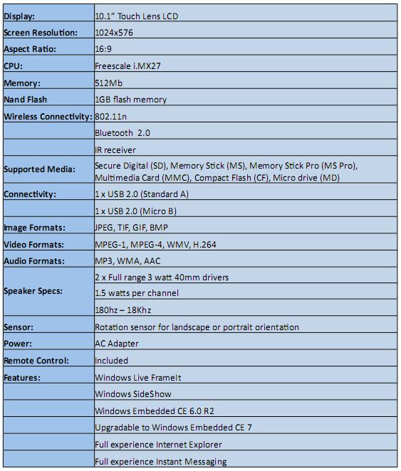 The whole thing is driven by a Freescale processor with 512MB of RAM and 1GB of flash storage, and there are twin 1.5W speakers plus a rotation sensor that will automatically flip the screen orientation. In addition to photo frame and internet widget duty, it can also run Internet Explorer and various IM clients.