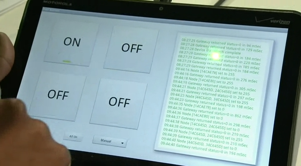 In the original presentation of Android@Home, an app with four off/on switches was presented with data flowing to the right on a Motorola XOOM tablet's display. This app connected with a set of four lamps, each simply controlled by the app and connected with the protocol written for Android@Home. Very simple stuff. The next example was an app that connected to your alarm clock/stereo and your lights throughout a room – this app gradually raising the brightness of the lights and turning up the sound on your stereo as the time for your awakening in the morning approaches.