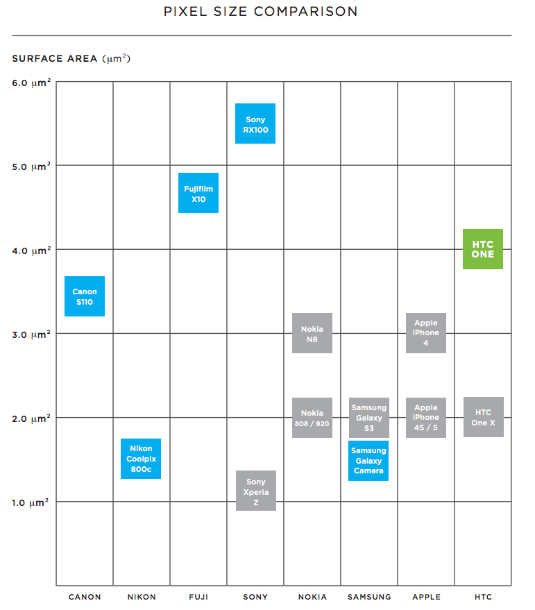 Each photo you're going to be taking will be 2688 x 1520 pixels in size on the HTC One at a 16:9 aspect ratio, and you've got a 5 piece lens element setup with a focal length of 3.82mm. Each one of the pixels you're picking up here is a 2.0 micrometer UltraPixel. These pixels have "effectively" twice the surface area of the standard pixels you're working with on 8MP and 13MP setups, those being generally 1.4 micrometers and 1.1 micrometers respectively.
