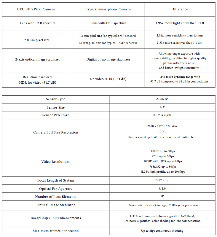 With the UltraPixel Sensor collecting UltraPixel-sized pixels, you'll be getting the ability to capture "300% more light than many of the 13 megapixel cameras on the market." Each pixel contains more light and more data than ever before, all this with a sensor whose size is equivalent to that of a standard 8MP or 13MP smartphone camera. This UltraPixel Sensor is a CMOS BSI and is classified as having a 1/3' sensor size.