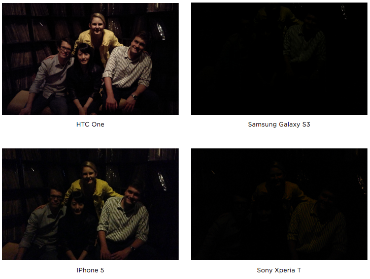 HTC shows quite simply how the HTC One uses the largest of three apertures available in some of the best selling smartphones on the market today, with the Galaxy S III working with an f/2.6 and the iPhone 5 utilizing an f/2.4. With the HTC One's f/2.0 size, one whole heck of a lot more light is able to be let in, this resulting in better results in low-light photo conditions.