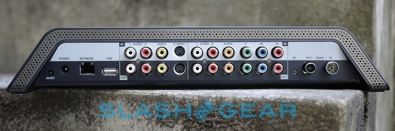It's on the back that the action happens, with the whole rear panel covered in connections. The number of ports is actually deceptive, since most are actually pairs: one set of inputs and then another set of matching outputs so that you can slot the PRO-HD in-between the source and the local TV. From left to right there's the reset button, power input and ethernet, an unused USB host port, then the SD inputs (L/R audio, video and S-Video), the HD inputs (L/R audio, S/PDIF and component video), the IR blaster port and then coaxial input/outputs. Notably missing is HDMI and any sort of integrated wireless; both would have been helpful additions, given that they're increasingly common A/V and networking standards.