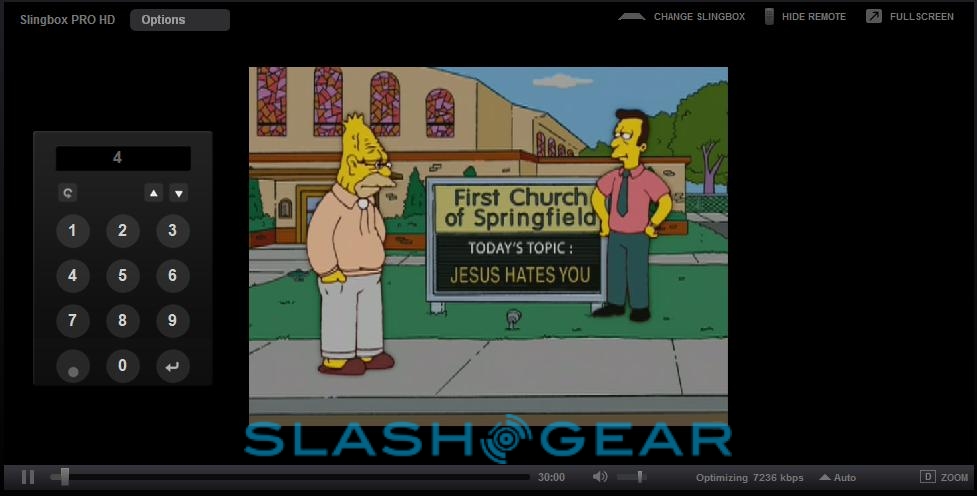 After that hiccup, we told the Sling setup wizard that it was connected via the coaxial port (it was unable to locate the input automatically) and it tuned in the available Freeview stations. From that point we had a simple video window – which could be resized or made full-screen – and an optional on-screen remote control panel. The latter was a decidedly simple affair, just numeric keys, a last-channel button and channel up/down controls, plus a numerical display to show channel number.