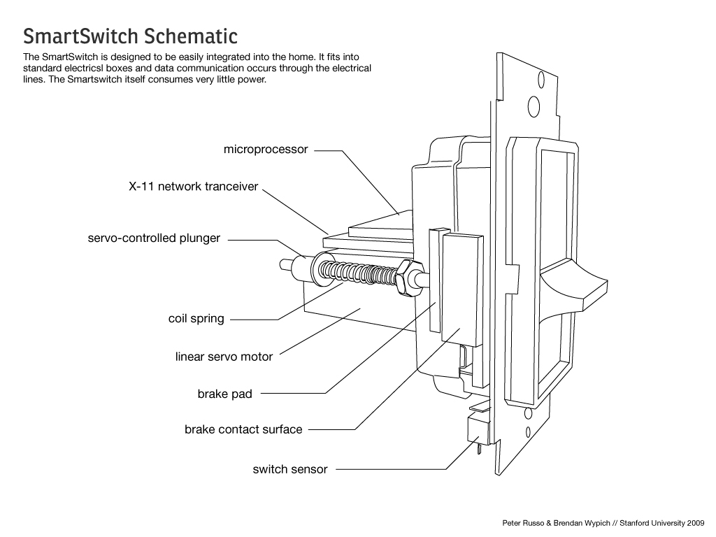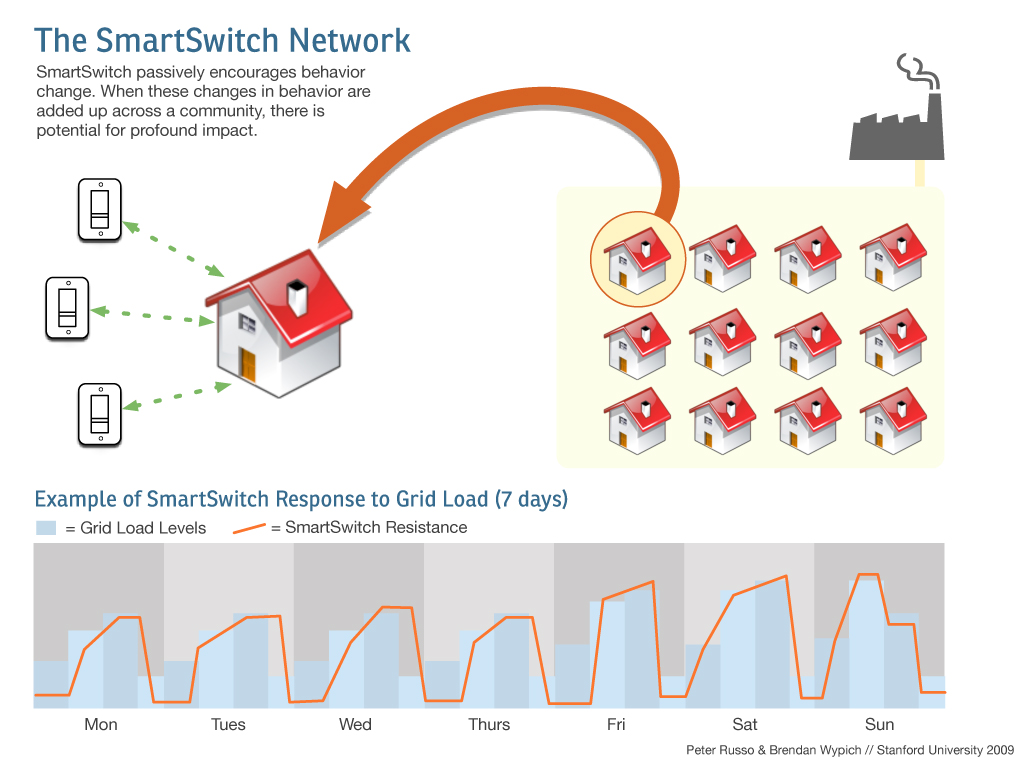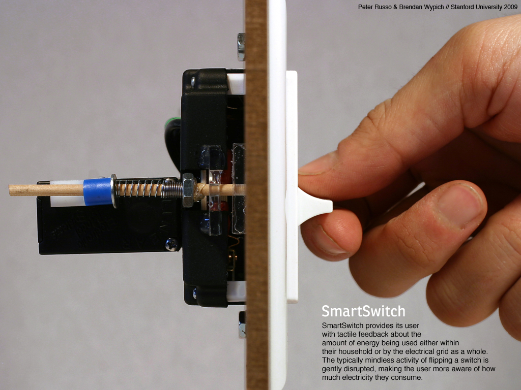 "Equipped with a network connection and a brake pad, the switch provides its user with tactile feedback about the amount of energy being used either within their household or by the electrical grid as a whole.SmartSwitch doesn't restrict the user from turning on a light, but rather it passively encourages behavior change. SmartSwitches can be programmed to respond to either personal or communal electrical usage. In a home wired with SmartSwitches, lights can become harder to turn on during hours of peak demand. The switches can also be customized to reflect household-specific energy conservation goals."