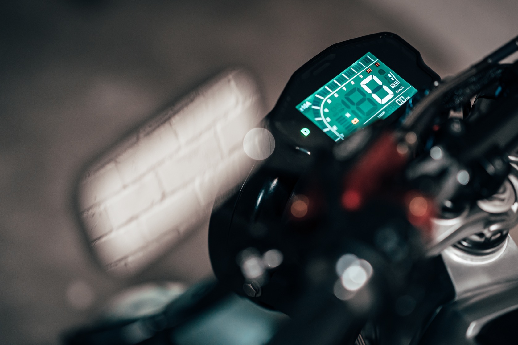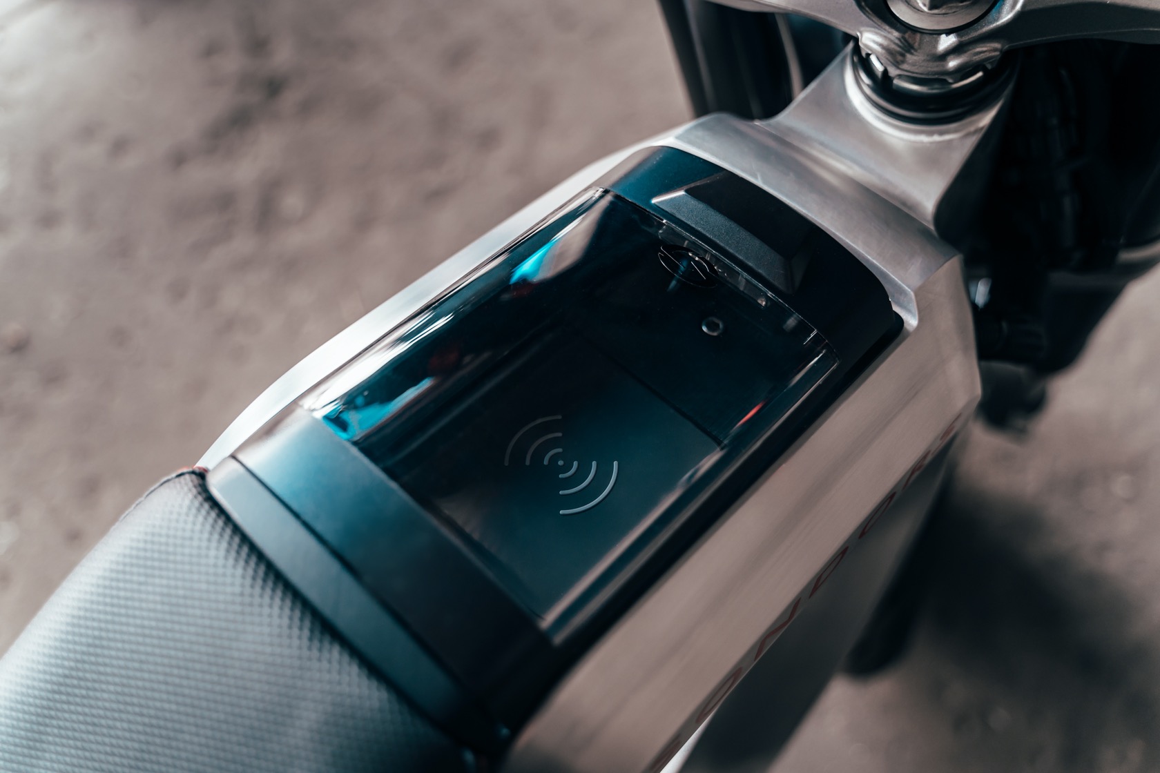 It recharges either from a public charger or by removing the battery and bringing it indoors: figure on four hours for a full charge in the latter case. On the top of the bike is a wireless charging pad for your phone, and as you'd expect the whole instrument panel is digital.