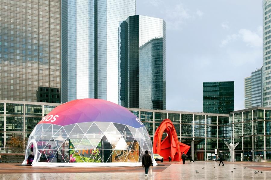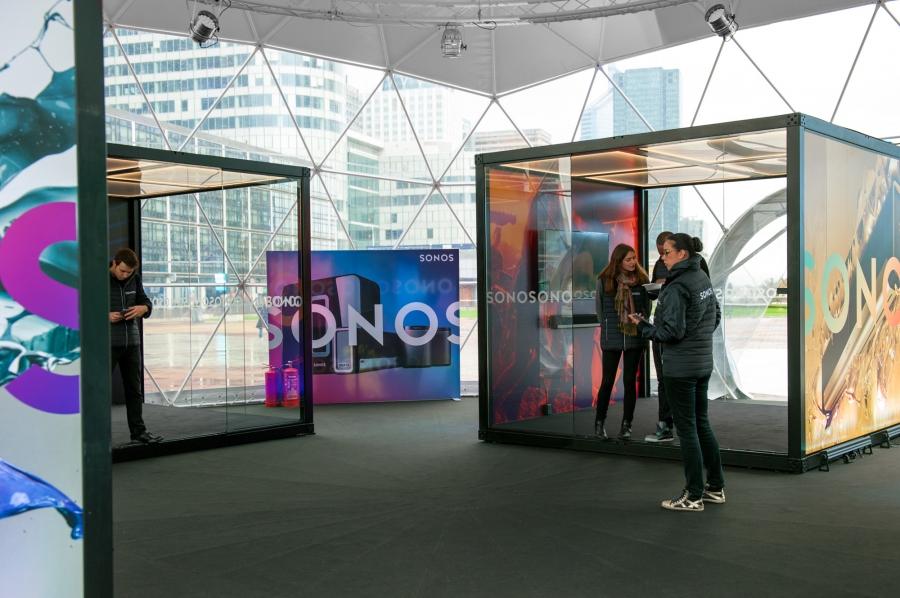 Below you'll see the construction of a pop-up showroom utilizing the new design language created by Bruce Mau Design for Sonos in full effect.