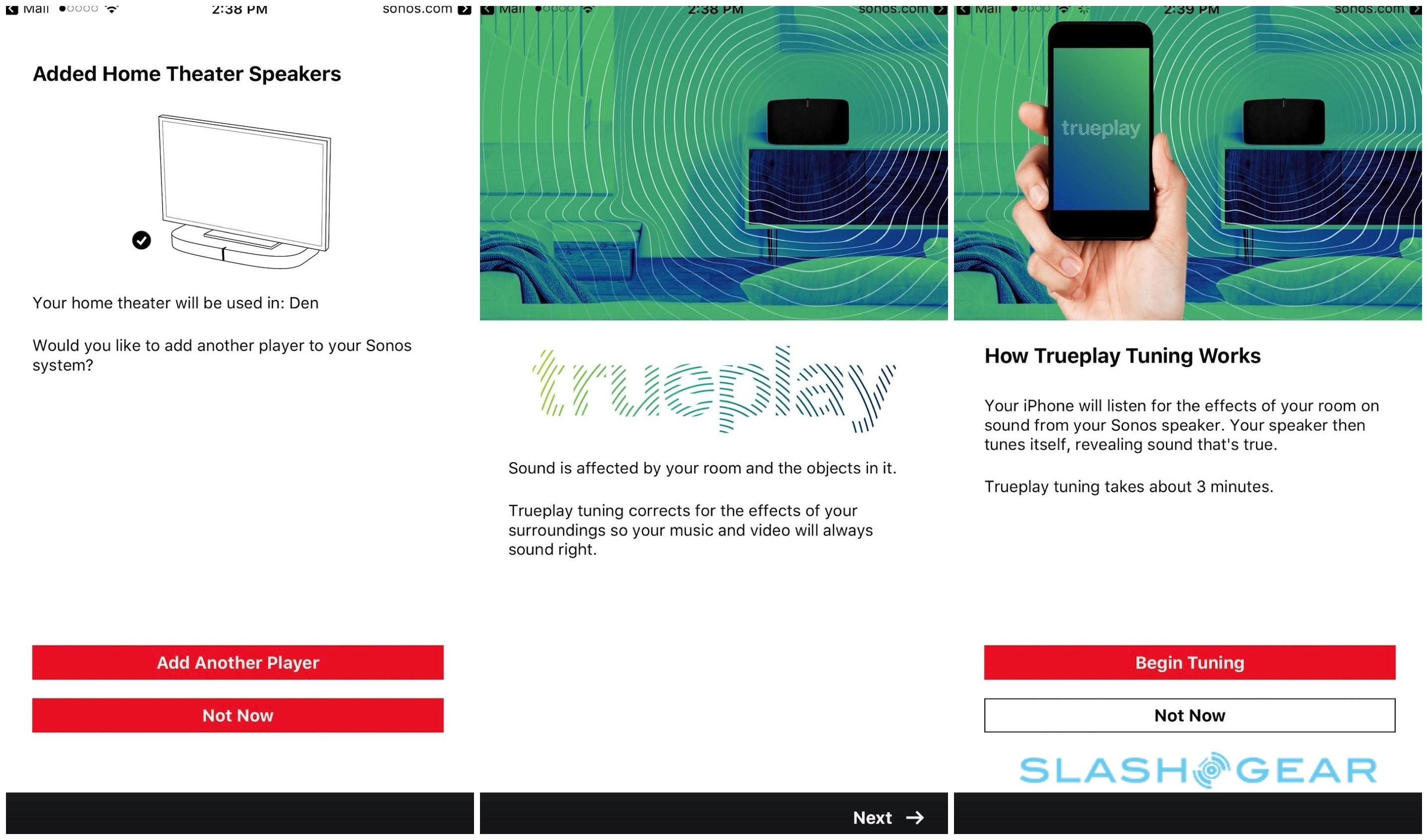 Launched in 2015, Trueplay basically uses your iPhone or iPad as a calibration microphone. First, you sit in your typical TV-watching position with the phone held at head-height, as a series of booming tones are played. Then, you walk slowly around the room, waving the phone up and down as more tones sound. After a few seconds' consideration, the PLAYBASE adjusts its own EQ settings to take into account reflective surfaces, walls that may be nearer on one side than the other, and other placement compromises.