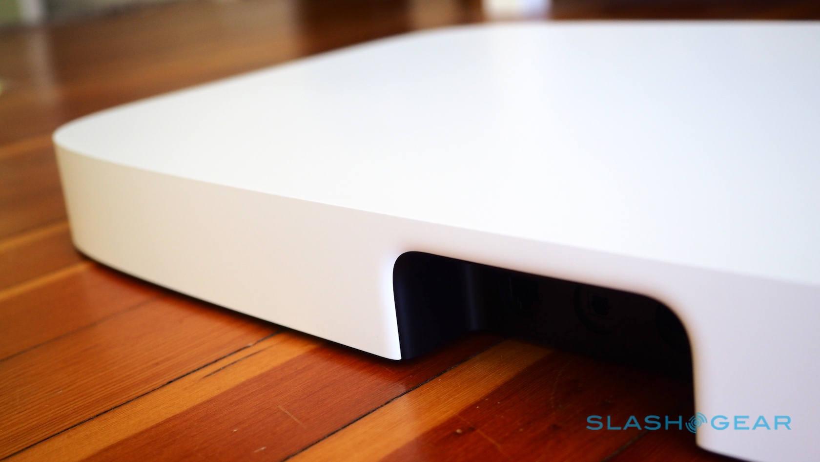 The front and sides are peppered with holes, around 43,000 of them, including across the Sonos logo. Like the second-generation PLAY:5 there are touch-sensitive buttons for play/pause and volume on the top edge. Unlike the PLAYBAR – which remains on-sale alongside it – there's no capacity for wall-mounting.