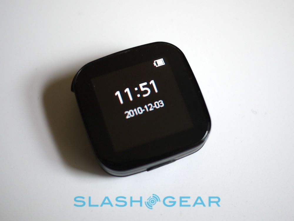 Measuring in at 35 x 35 x 11 mm, the plastic-bodied LiveView is a lightweight if somewhat thick black square, fronted by a 1.3-inch 128 x 128 color OLED display. On the back there's a metal clip, sturdy enough to keep the LiveView fixed snugly to your lapel or the shoulder-strap of your bag; Sony Ericsson also supply a nylon wrist-strap and a plastic frame assembly to turn the LiveView into a chunky watch. Hardware controls are limited to a power button with integrated multicolor LED on the top left corner and a second button on the top right; on the bottom edge there's a microUSB port for charging, covered with a somewhat fiddly rubber flap.