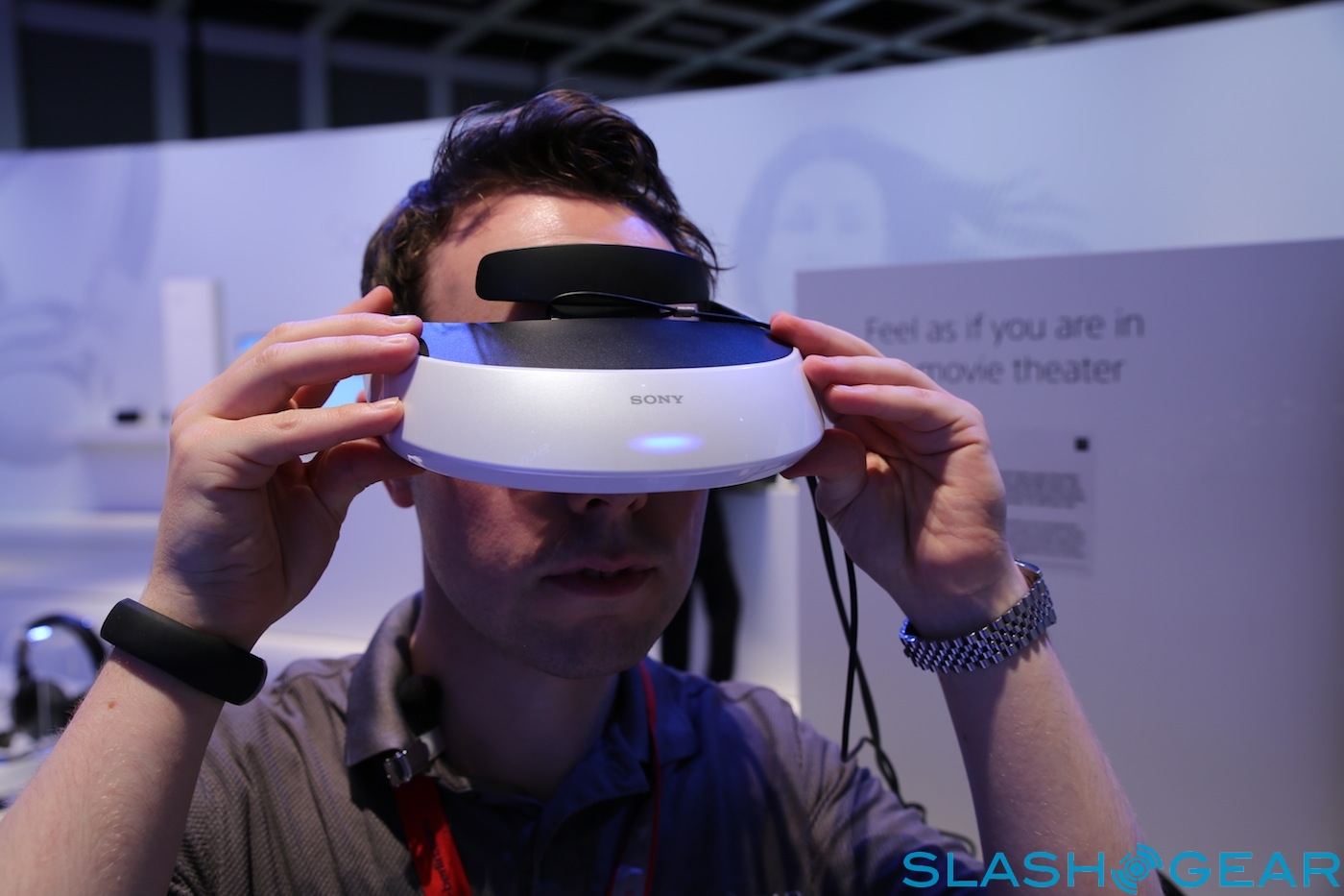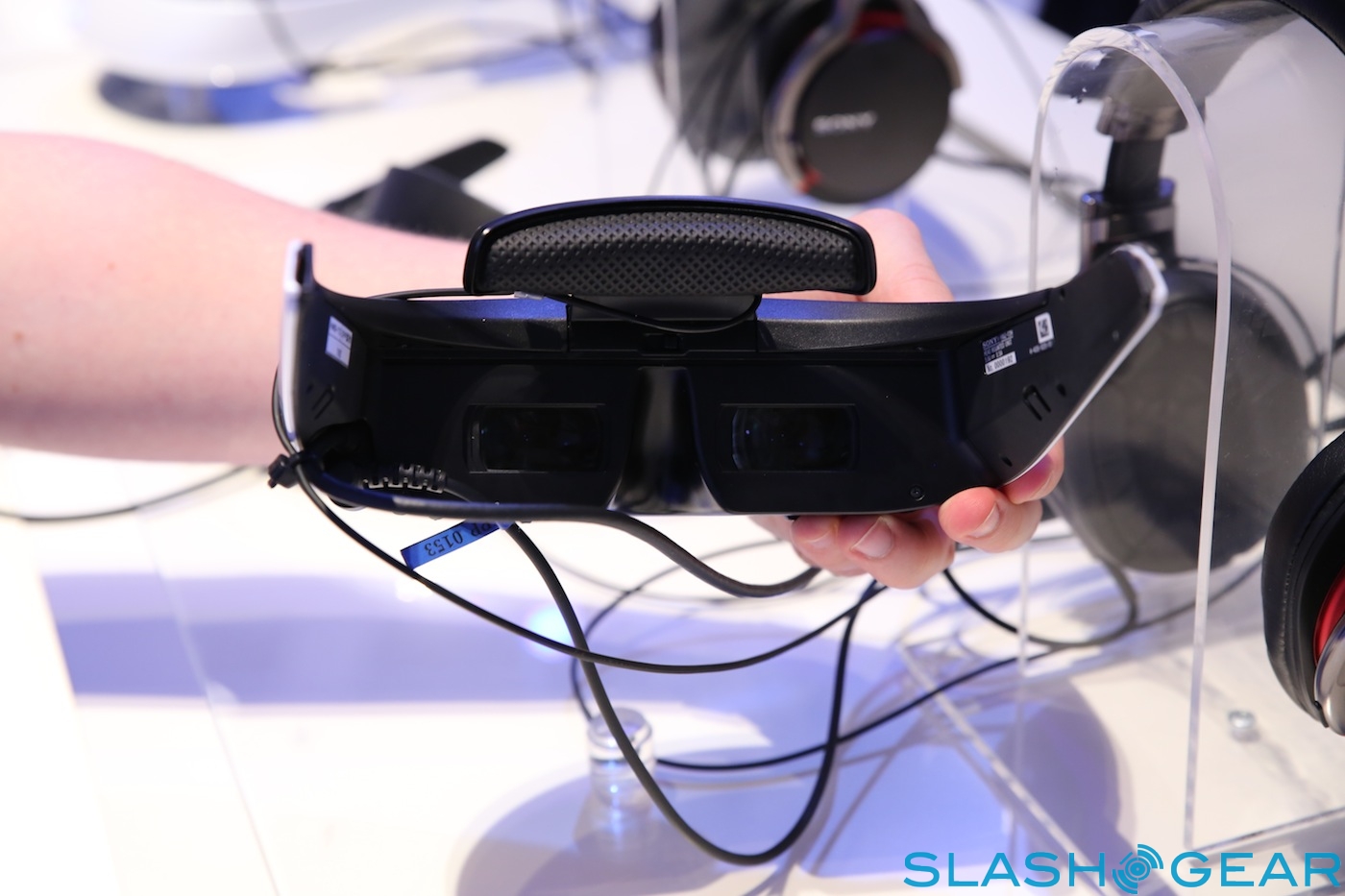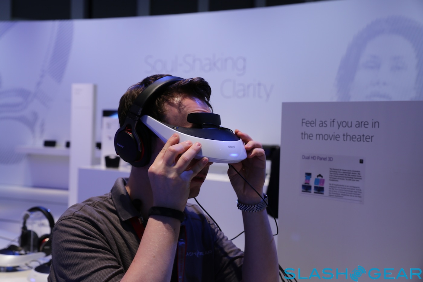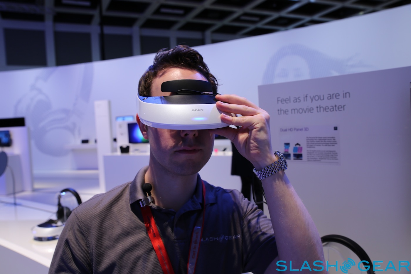 Where wearables like Google Glass focus on overlaying digital data on top of the virtual world, Sony's headset hopes to take you away from it. The two OLEDs are enclosed in a white and black plastic visor – you can see your feet below you, but nothing ahead of you – and though they're each only 0.7-inches diagonal, the effect is of watching a considerably larger screen at a distance of several feet.