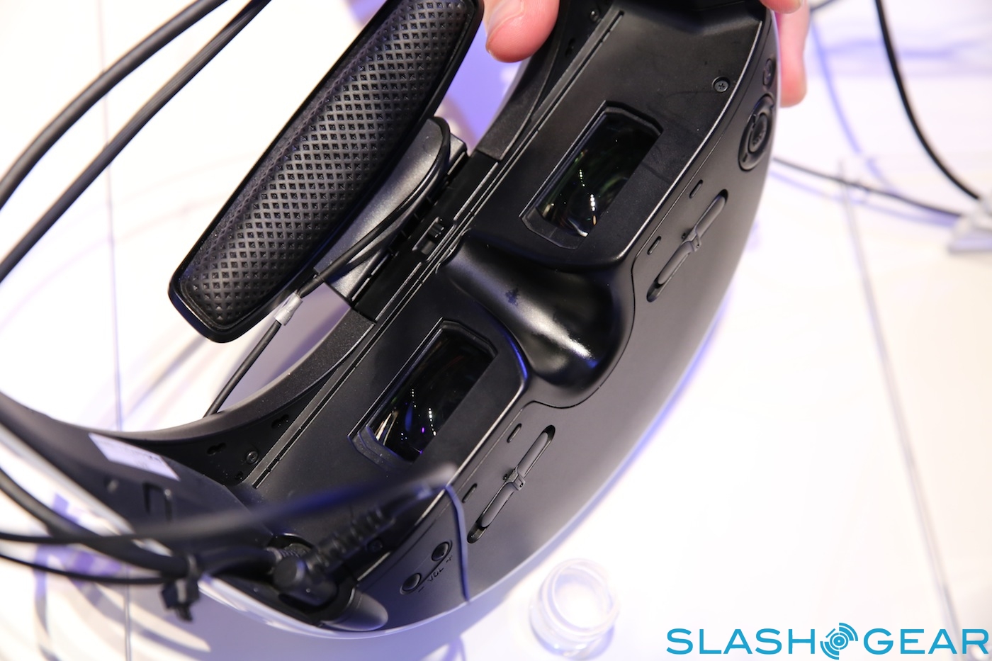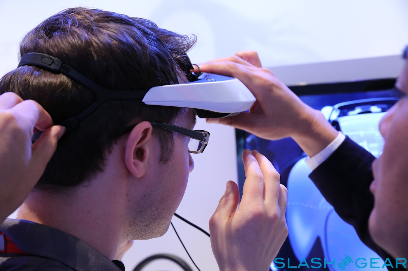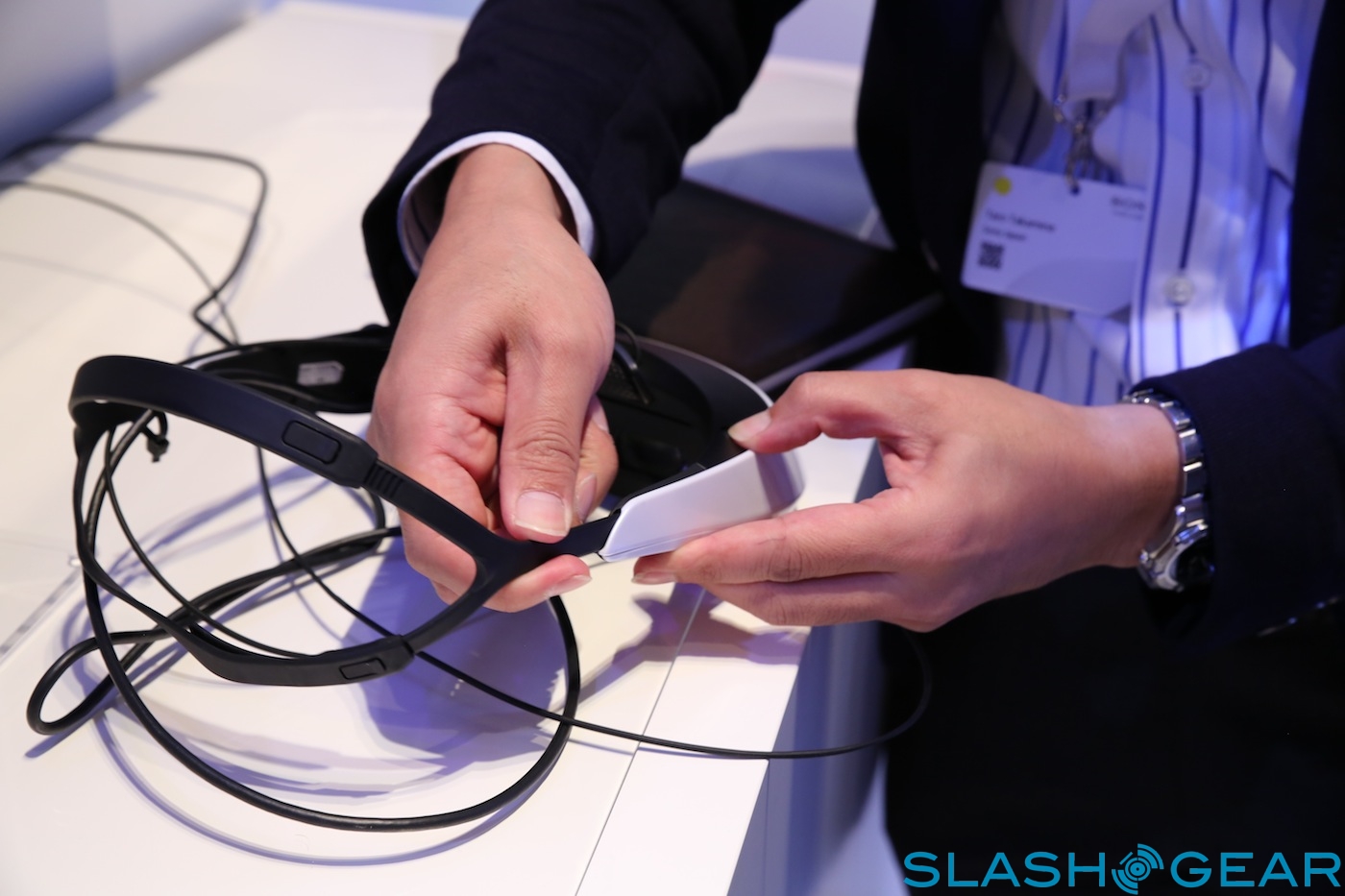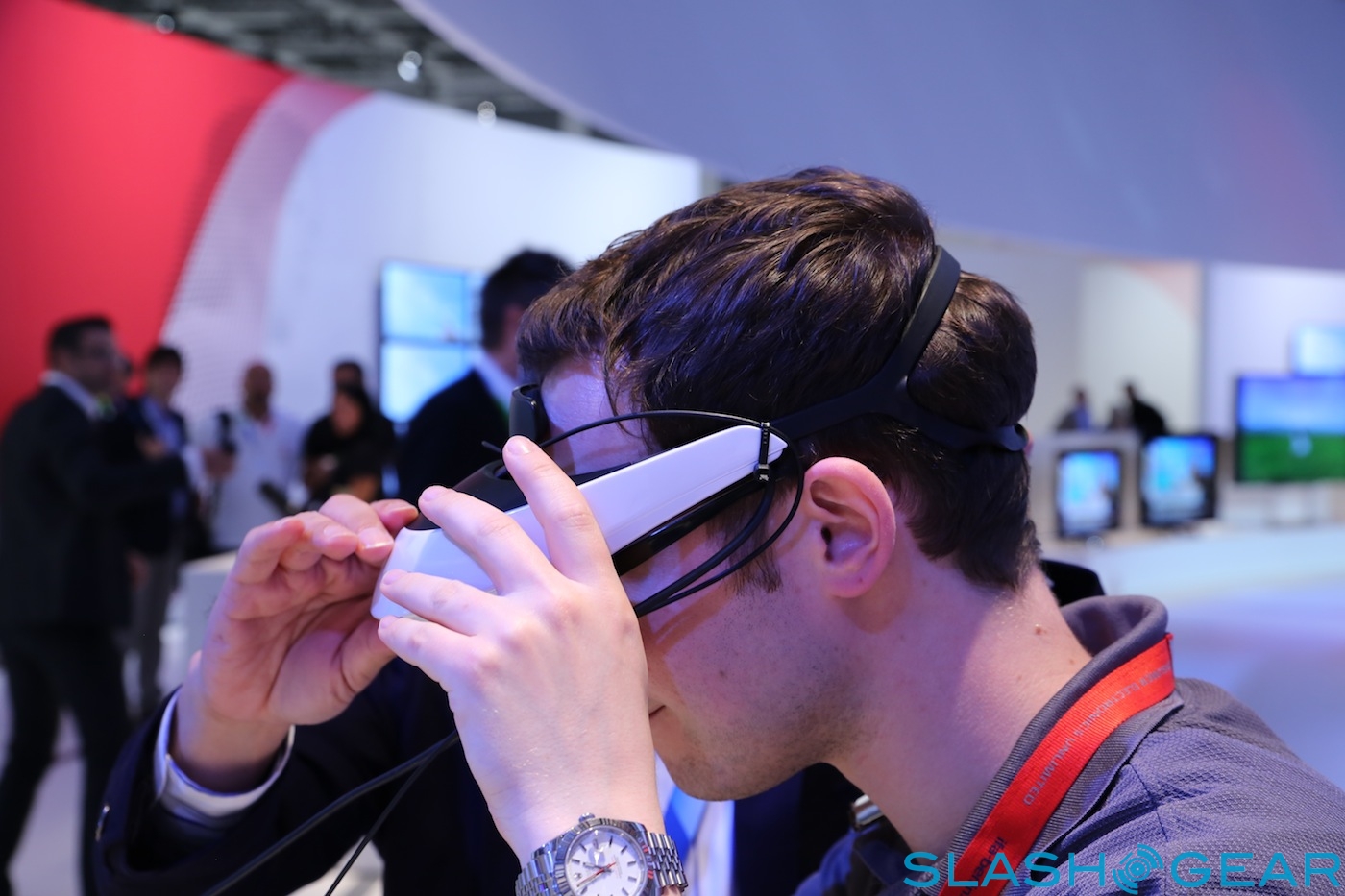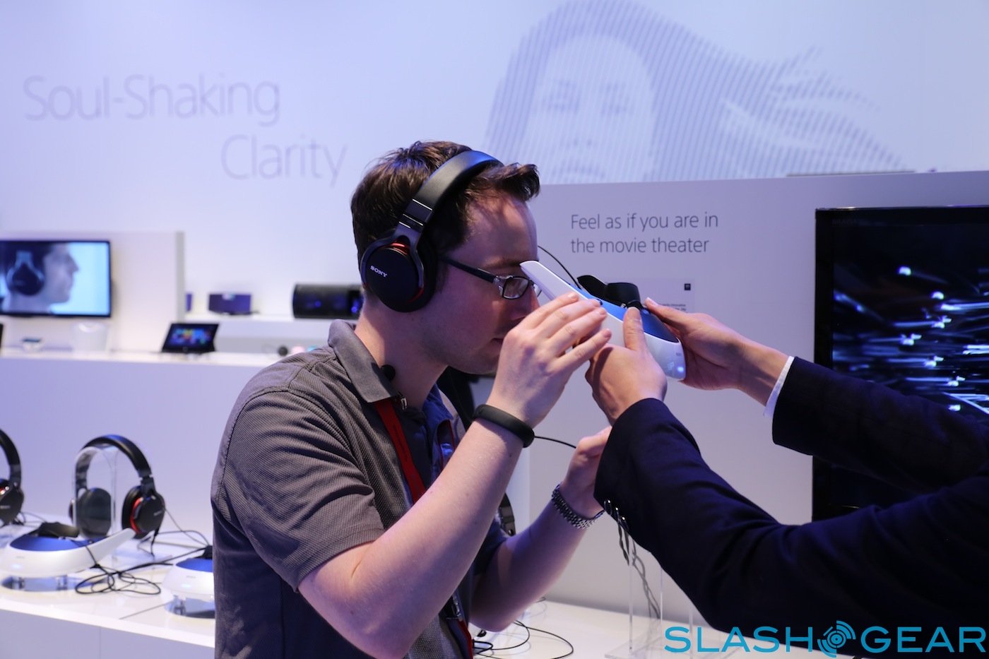Where wearables like Google Glass focus on overlaying digital data on top of the virtual world, Sony's headset hopes to take you away from it. The two OLEDs are enclosed in a white and black plastic visor – you can see your feet below you, but nothing ahead of you – and though they're each only 0.7-inches diagonal, the effect is of watching a considerably larger screen at a distance of several feet.