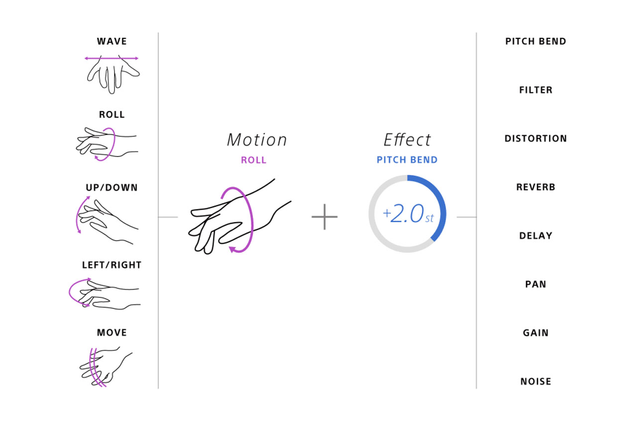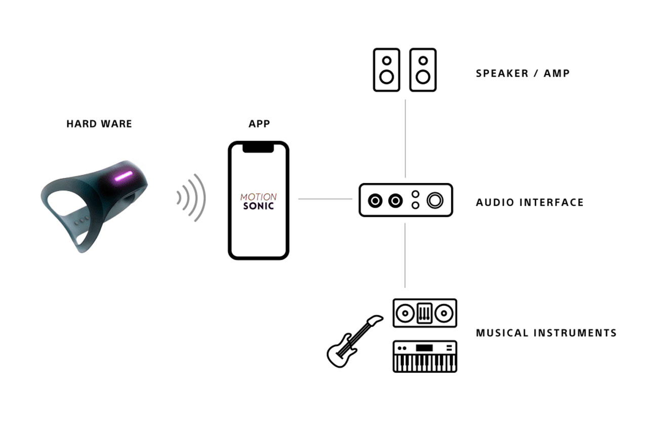 If a DJ uses Motion Sonic when the DJ raises their hand, a delay can be added to the music output. Motion Sonic is a system featuring a wearable motion sensor and a paired smartphone application. The sensor in the wearable device detects movement and transfers it to the smartphone app using Bluetooth. The Bluetooth signal connects to the instrument via an audio interface to actualize the desired sound effects.