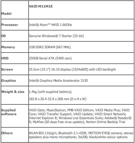 The new VAIO M Series mini notebook computer is available from the end of March 2010.