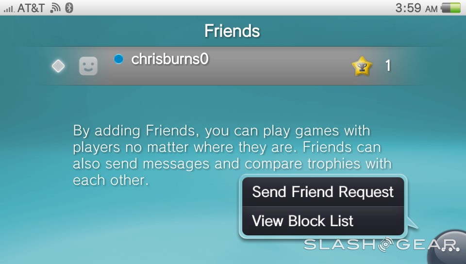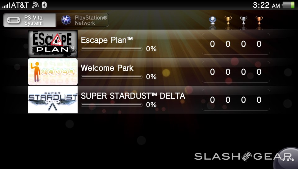 Like each of the other devices you've got connected to the PlayStation Network (ie your PlayStation 3), you've got this space to check out your awesome accomplishments for each game that you've got on your device. You can either just bask in the warm glow of your own trophies here or compare with people you've connected with in Friends.