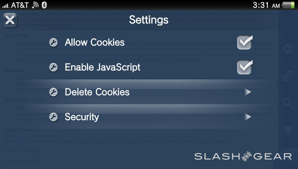 The web browser that Vita OS uses appears very much to be a prime-time-ready look at the web, with an interface on the right-hand-side for heading back and forward, seeing multiple tabs, searching, and seeing favorites along with settings at the bottom bubble. Inside your setting you've got such items as security and javascrip which you can turn off or on. Scroll down and the URL bar disappears up with the top of the page, this browser acting like an app that's fully aware of the display size its working with and certainly making the best of it.