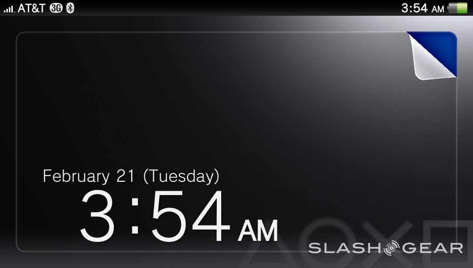 As a sort of foreshadowing of what's to come, the first screen you see when you turn the device on from sleep is the lock screen with the same sort of peel-back feature as your LiveArena Screens. Here you'll also see a clock and date and your top bar minus your Notifications bubble. Peek this screen back like a sticker to get into Vita OS.