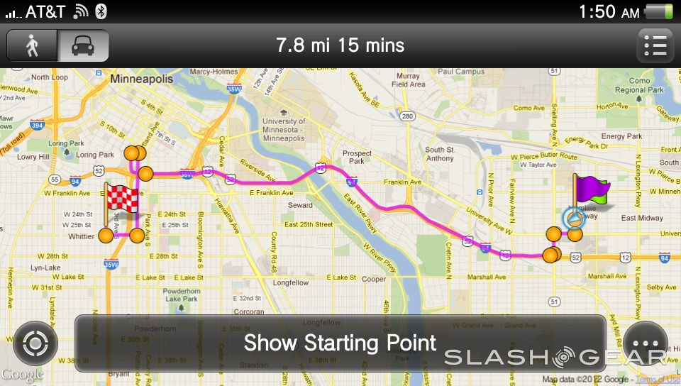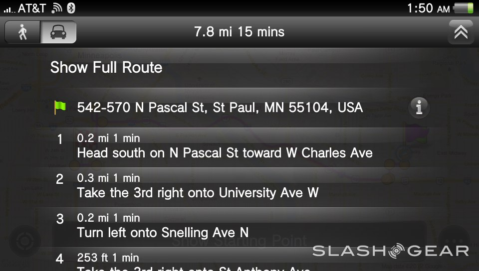 Google Maps is what powers this application, the interface not unlike what we've seen from iOS or Android in the past. You wont get turn by turn directions read aloud to you here, but should you have a navigator in the vehicle with you to read them out loud, you'll be golden. This device has a GPS sensor which allows for your location and the location you're headed to to be found easily, and the PS Vita does appear to have an excellent sensor in place as locations are found without much delay at all. Car and walking directions are included here (while the Android version also has public transport and more.)