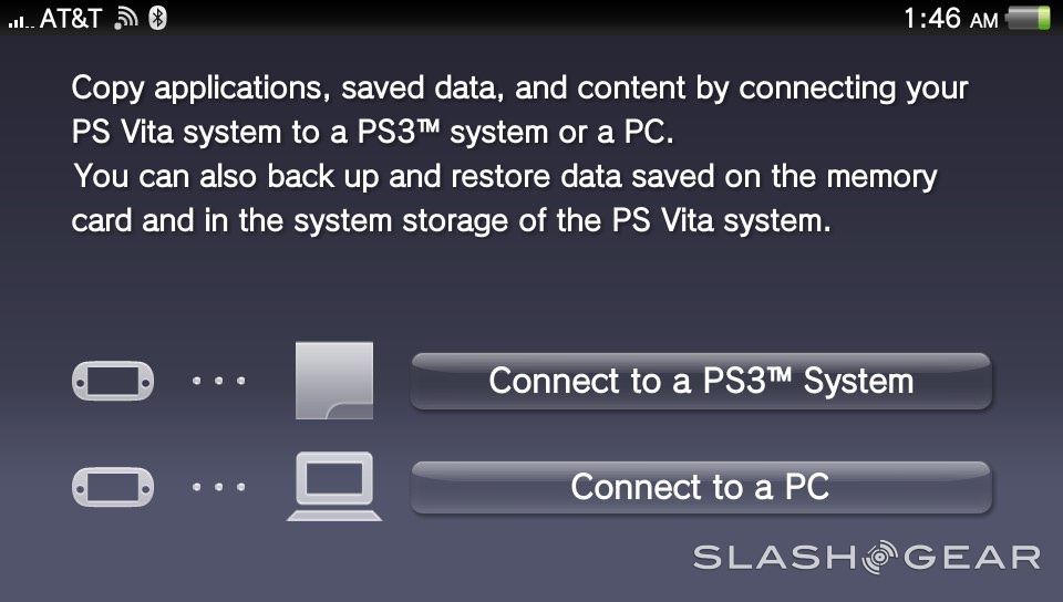 As all mobile-based operating systems should, Vita OS has a portal through which you can manage and transfer your files to and from your desktop computer. Through this app on the PS Vita you're able to copy content to or from your PC or backup, restore, or delete backup files. If you're transferring files, you get the option of moving photos, music, video, and applications – this including the applications themselves or just the data from them.