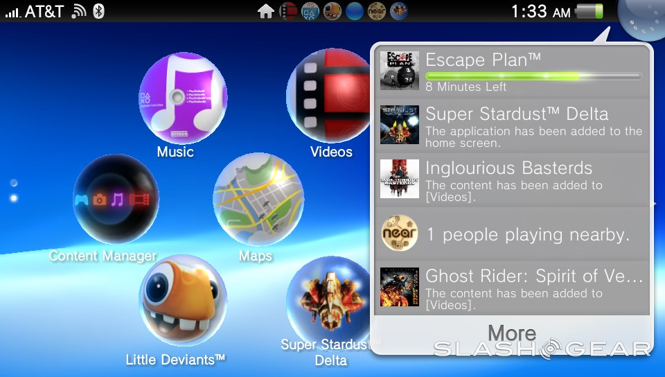 The top bar of Vita OS looks extremely similar to Android and displays information basically in the same way. The difference is that when you've got apps open, you can see a line of them represented by tiny bubbles one next to another. On the very right there's a bigger bubble that shows you your activities – mostly you'll be using this to show how far your downloads have come – each notification is also a link to the service it's informing you about, too, so if you've just completed your download of a game or the newest episode of Saturday Night Live, you can head right into it.