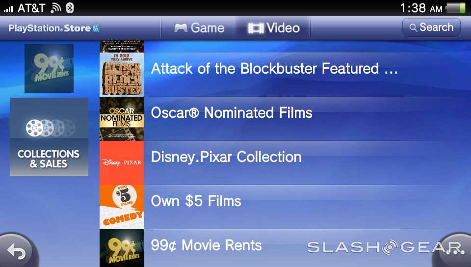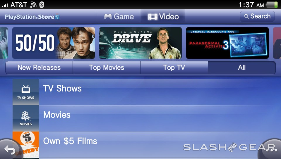 Probably the most heavily tread LiveArea card in the whole operating system is the one made for Videos as Sony's own PlayStation Store has movies and TV show episodes for sale – so essentially your whole LiveArea is covered with links to videos you can go to the store and pay for. The Videos app from there is a very basic interface with separations between All, Rented, and transferred in from your PC, with these screens and the videos themselves having screenshot disabled so you can't break any snapshot laws. Inside a video you'll also find a very basic set of controls with the ability to scrub through a video based on different intervals if you wish – 1 to 5 minutes to get through Inglorious Basterds with just a handful of clips – very convenient!