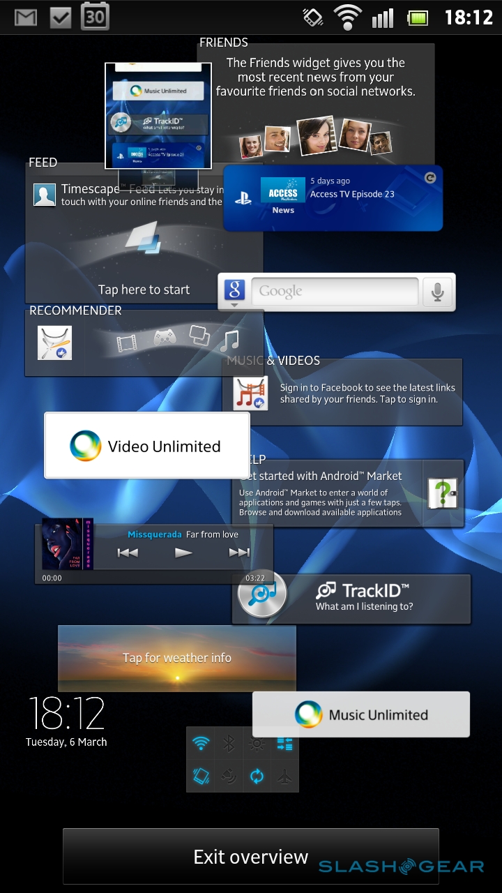 The UI itself is clean and reasonably intuitive, though Sony does clutter up most of the five homescreen panes with widgets from the start. The lockscreen gets basic notifications, though no HTC Sense-style shortcuts. A pinch-zoom gesture shows a floating cloud of all those widgets rather than the more traditional preview thumbnails of the panes themselves, and Sony has built in a useful screenshot tool, with an option in the power menu accessed by holding down the power/lock button.