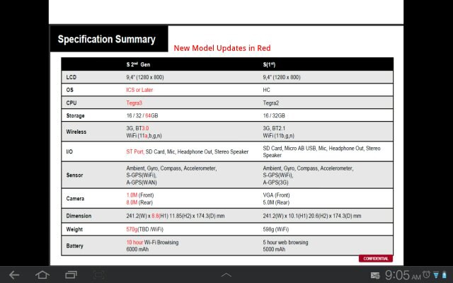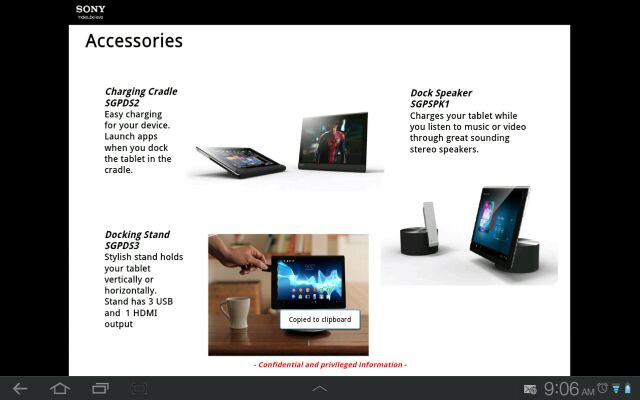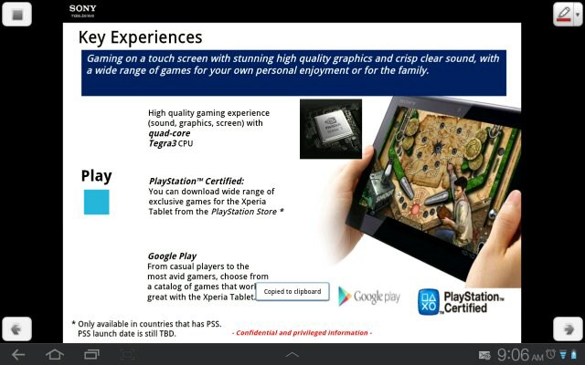 Sony's next Android slate, the Sony Xperia Tablet, has been spotted in a set of leaked presentation slides, a slimline and splashproof Tegra 3 model with a 9.4-inch 1280 x 800 display. The Xperia Tablet SGPT1211 keeps the folded-paper profile of its Tablet S predecessor but trims it down to 11.85mm at its thickest according to mobiFlip's premature documentation; overall, it's 42-percent thinner, Sony claims, and made of aluminum rather than plastic.