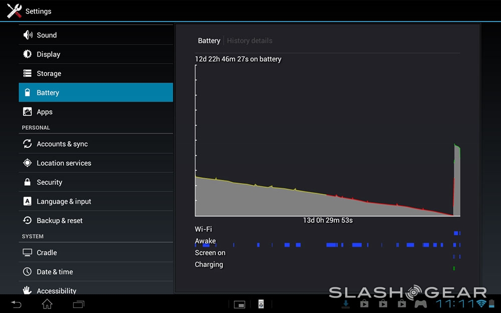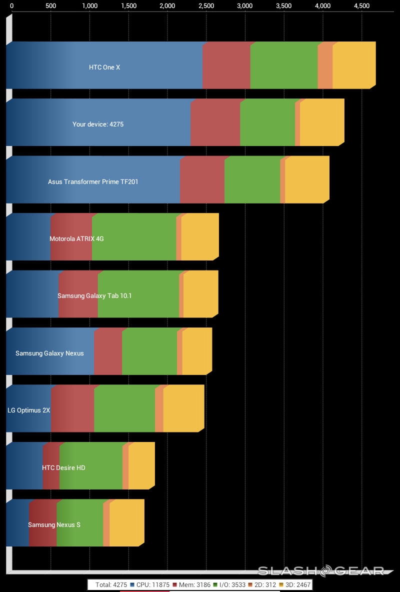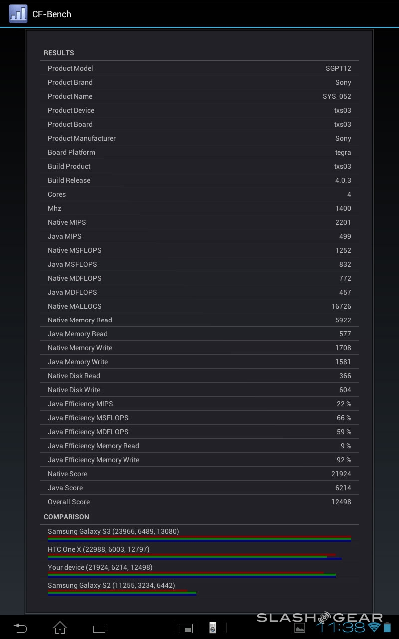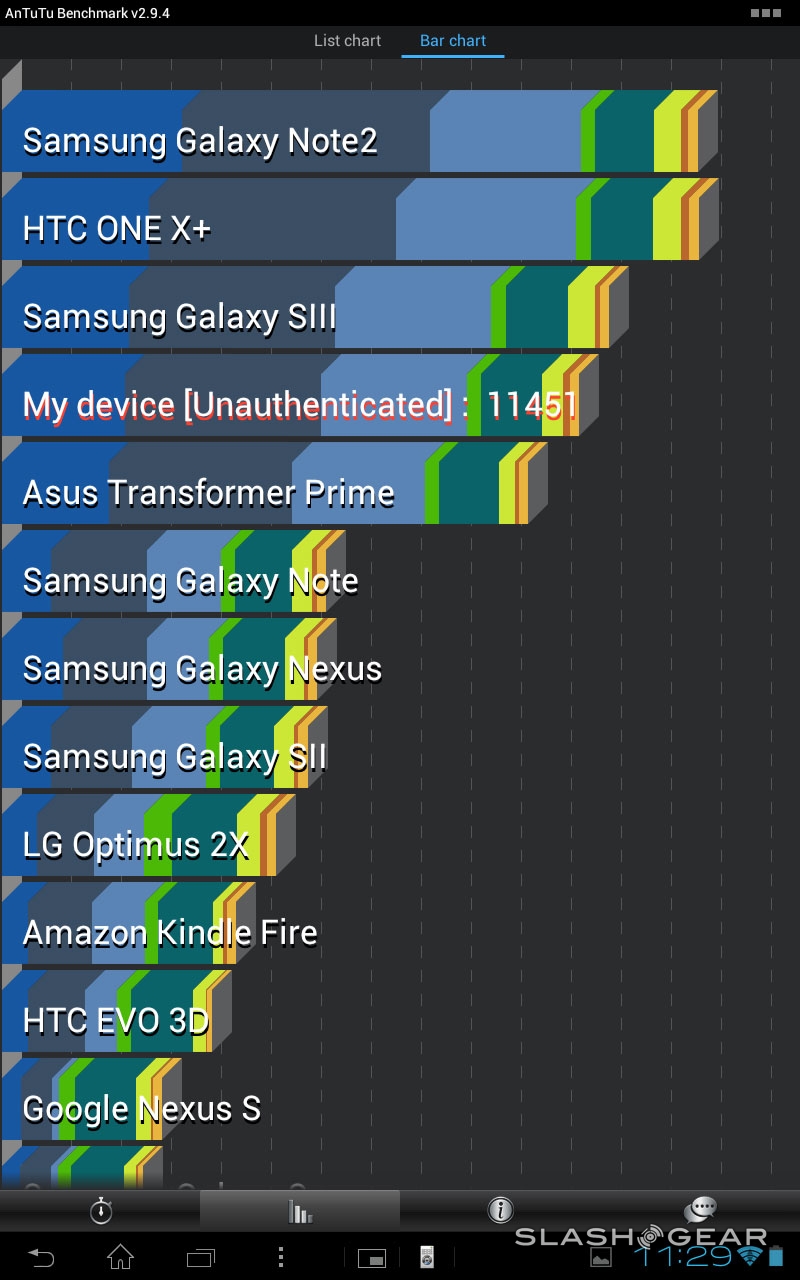 Above you'll see some standard benchmark results as well as an astounding battery readout. As with all of the devices on the market with the NVIDIA Tegra 3 quad-core processor inside, this device has fantastic standby-time as it utilizes NVIDIA's 4-PLUS-1 technology – in this case that means that the "ninja" core (there's 5 cores inside the processor in this device, not just 4) works for low-power tasks and makes the time the display is off a time that the device isn't hounding power – as it should be!