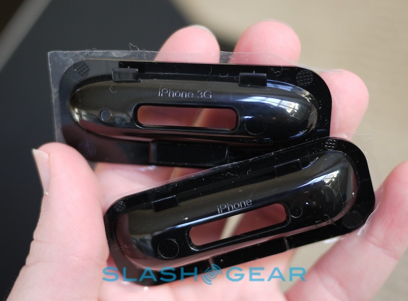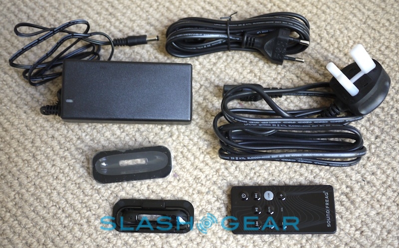 There's no missing the SFQ-01A, a slab-sided chunk of high-gloss black plastic with a narrow control pad and discrete orange side lighting. At £199.99/$199.99 it's not an inexpensive dock, and we wish some of that had shown up in more expensive plastics; it's not exactly lightweight, but then neither does it have the heft of some similarly-priced units. It's also a dust and fingerprint magnet. In the box, SoundFreaq include the SFQ-01A itself, a small IR remote, two interchangeable dock adapters (for the original iPhone and iPhone 3G), an AC adapter (and, with our unit at least, both UK and Continental Europe power cables) and a 3.5mm stereo audio cable. There's also some easy to follow documentation, printed on too-big-to-miss sheets of cardboard.