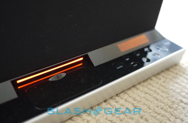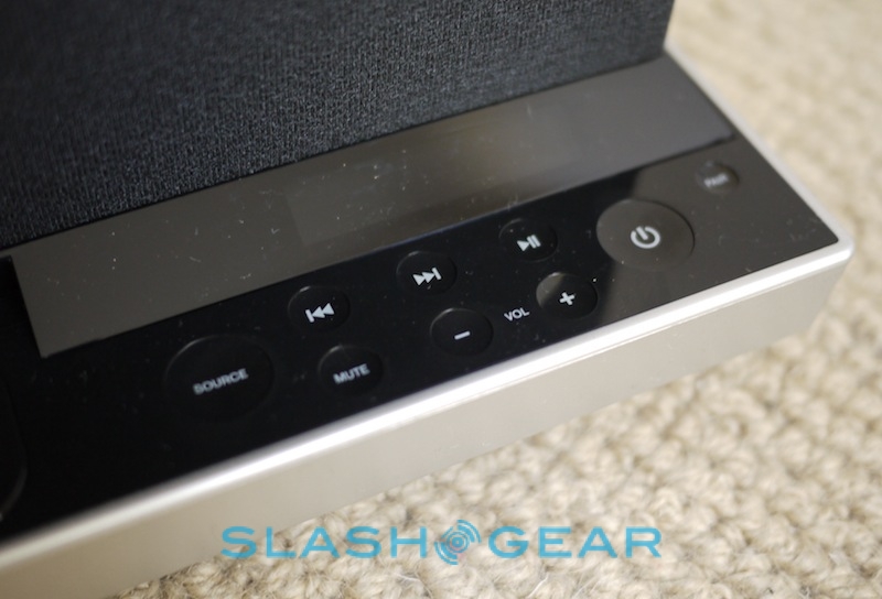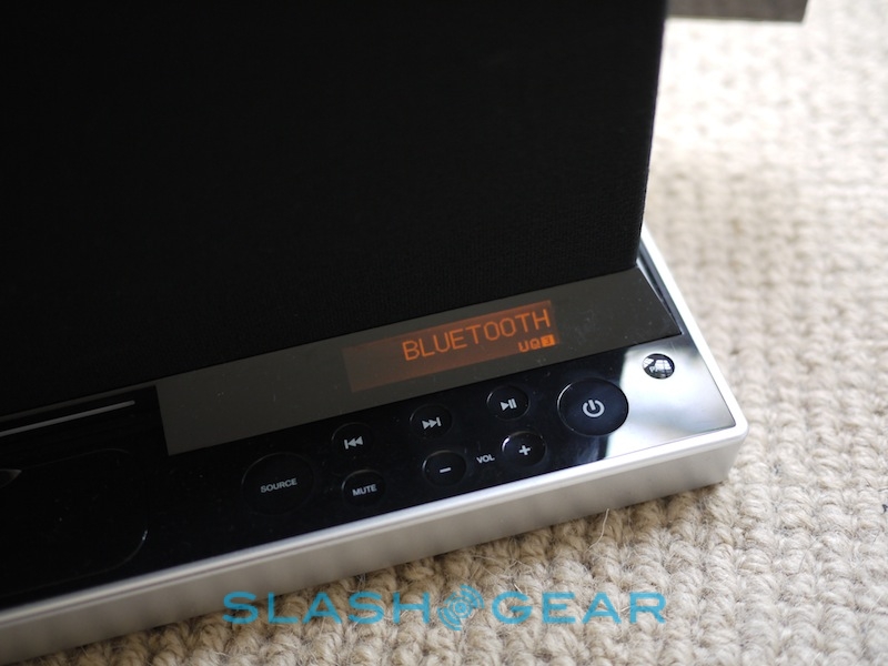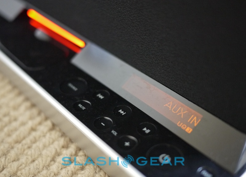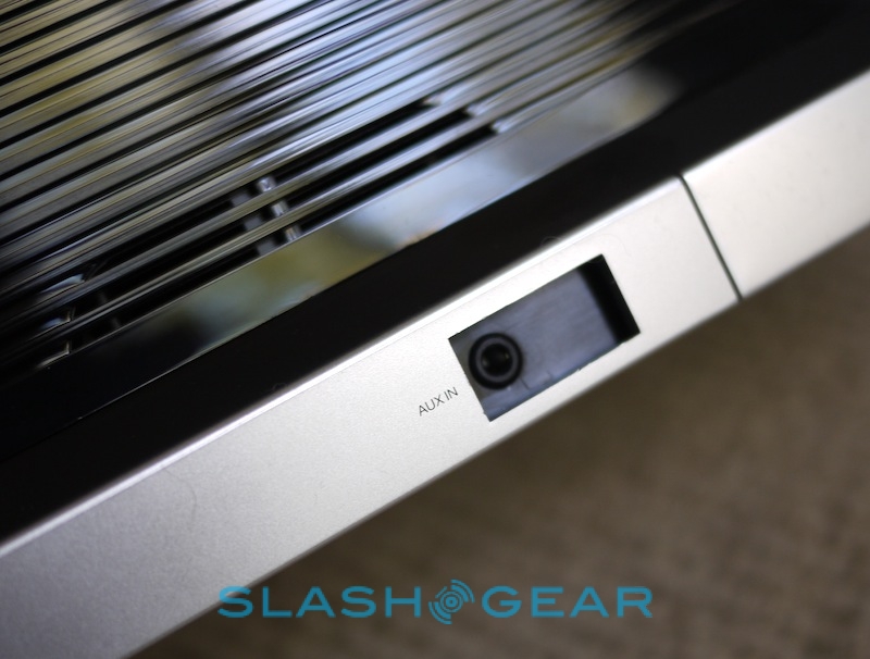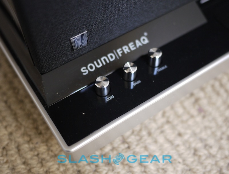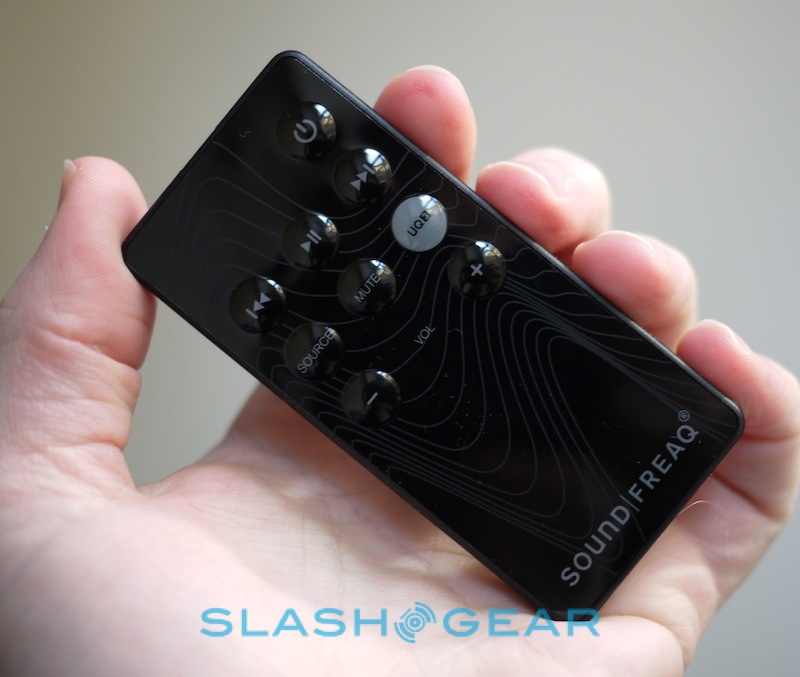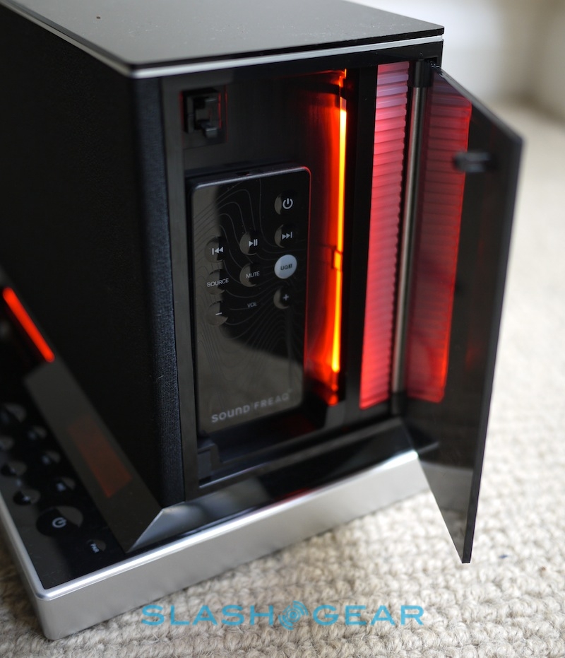 Controls are limited to the lower front panel, with three silver knobs on the far left – for controlling treble, bass and SoundFreaq's own UQ3 audio processing system. On the right, there's an array of concave, touch-sensitive buttons for source, track skip, play/pause, volume, mute, power and Bluetooth pairing, underneath a small, orange LCD display. In-between there's the dock itself, with a plastic cover if you're not planning to actually slot in your iPhone or iPod touch. On the back there's the power port and a 3.5mm aux-in input, while on the right side is a small door to hide the remote (a magnet keeps it in place).